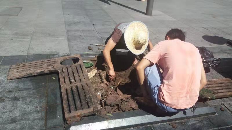 工作人员在杨家坪商圈挖掘白蚁巢穴