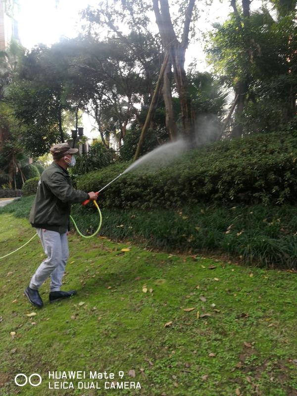 津城白蚁防治工作人员正在绿化带施药预防白蚁